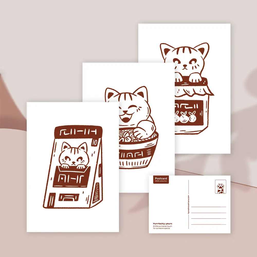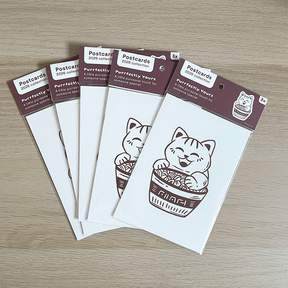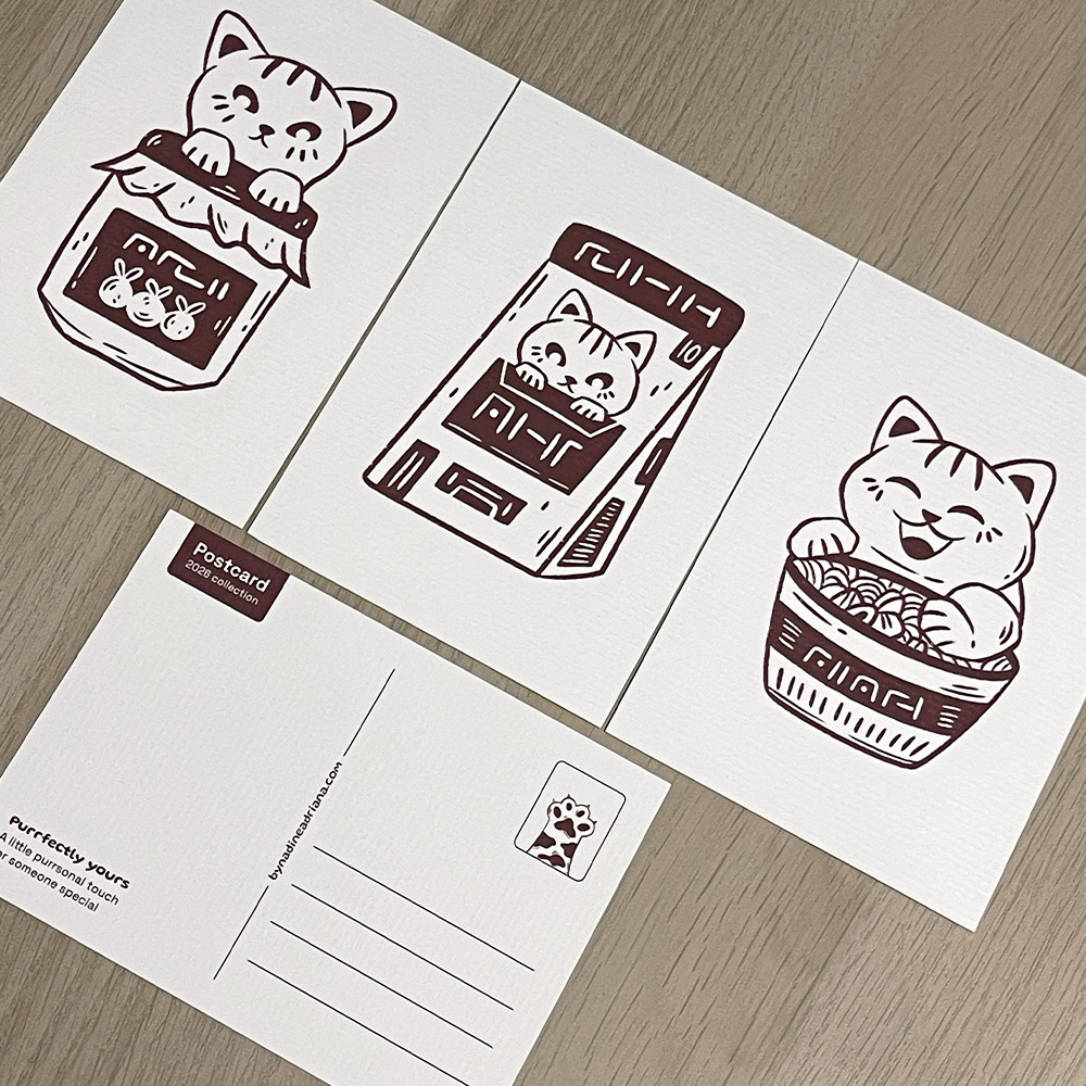 This Purrfectly yours postcard set includes 3 A6-sized postcards, perfect for sending a note, decorating your space, or sharing with friends. Each postcard is printed in full color on both sides on 300 g/m² old Dutch paper in a soft off-white tone.