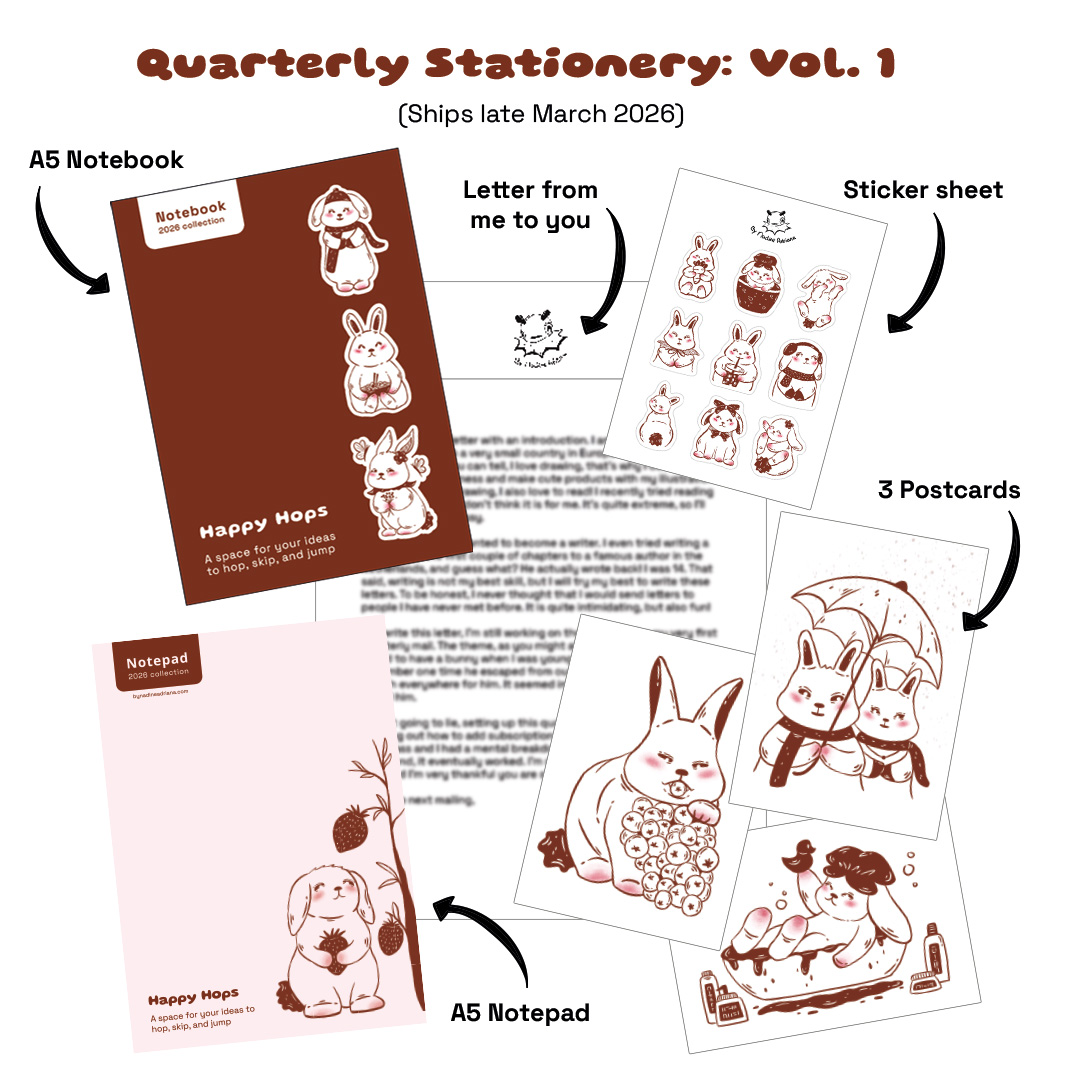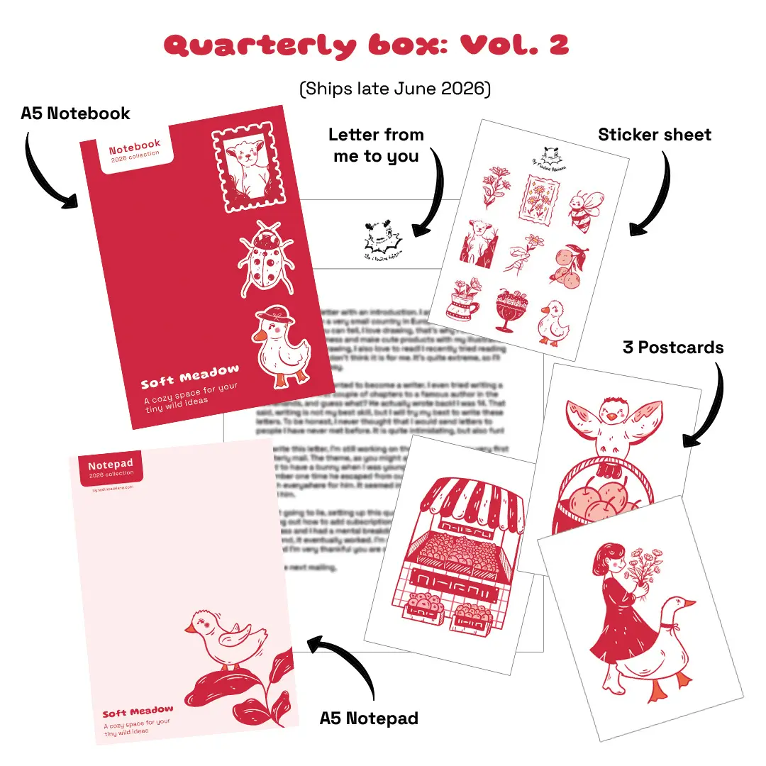 A curated quarterly stationery mail of exclusive illustrations, delivered mailbox-ready. Includes a notebook, notepad, sticker sheet, postcards, and a personal note.